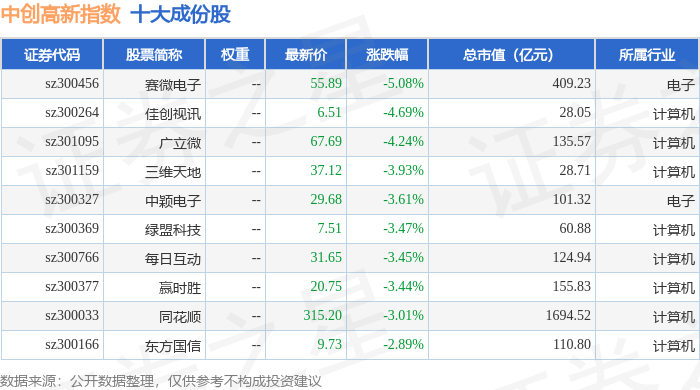 中创高新(399652)指数十大成份股详情如下: