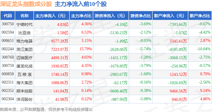 资金流向方面,深证龙头(399653)指数成份股当日主力资金净流出合计110.94亿元,游资资金净流入合计41.49亿元,散户资金净流入合计69.45亿元。成份股资金流向详情见下表: