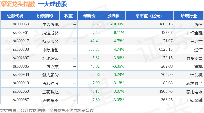 证券之星消息,12月11日,深证龙头(399653)指数报收于3012.43点,跌1.21%,成交1049.57亿元,换手率1.21%。当日该指数成份股中,上涨的有6家,宁德时代以1.73%的涨幅领涨,下跌的有43家,中兴通讯以10.0%的跌幅领跌。