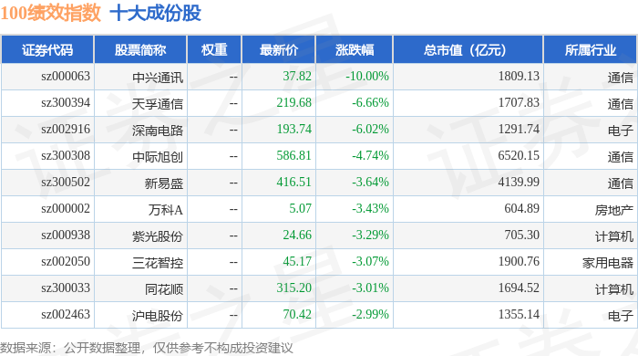 100绩效(399656)指数十大成份股详情如下: