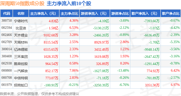 资金流向方面,深周期50(399670)指数成份股当日主力资金净流出合计52.08亿元,游资资金净流入合计13.67亿元,散户资金净流入合计38.41亿元。成份股资金流向详情见下表: