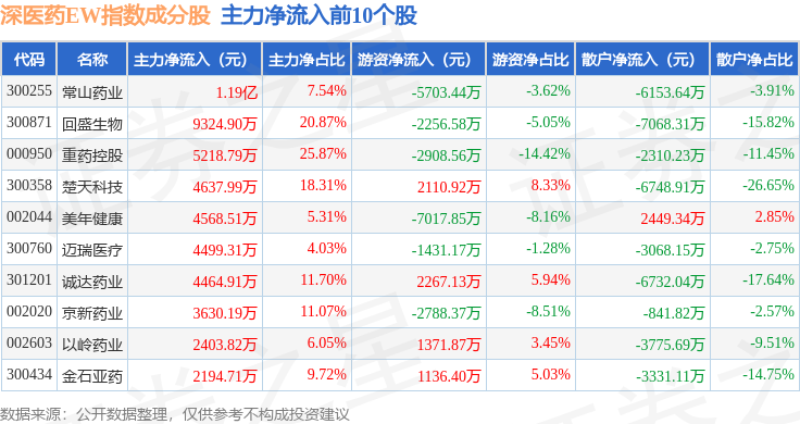 资金流向方面,深医药EW(399676)指数成份股当日主力资金净流出合计14.8亿元,游资资金净流出合计1.07亿元,散户资金净流入合计15.87亿元。成份股资金流向详情见下表:
