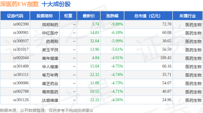 证券之星消息,12月11日,深医药EW(399676)指数报收于3724.23点,跌1.72%,成交373.53亿元,换手率1.94%。当日该指数成份股中,上涨的有24家,回盛生物以10.65%的涨幅领涨,下跌的有194家,信邦制药以9.88%的跌幅领跌。
