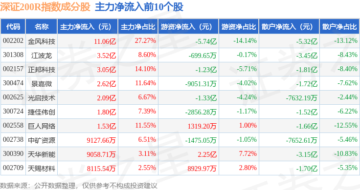 资金流向方面,深证200R(399679)指数成份股当日主力资金净流出合计61.95亿元,游资资金净流入合计11.17亿元,散户资金净流入合计50.79亿元。成份股资金流向详情见下表: