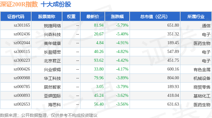 证券之星消息,12月11日,深证200R(399679)指数报收于6069.13点,跌1.09%,成交1546.24亿元,换手率1.57%。当日该指数成份股中,上涨的有31家,迈为股份以12.82%的涨幅领涨,下跌的有168家,锐捷网络以5.79%的跌幅领跌。