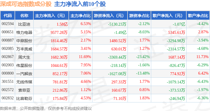 资金流向方面,深成可选(399683)指数成份股当日主力资金净流出合计31.28亿元,游资资金净流入合计2.8亿元,散户资金净流入合计28.48亿元。成份股资金流向详情见下表:
