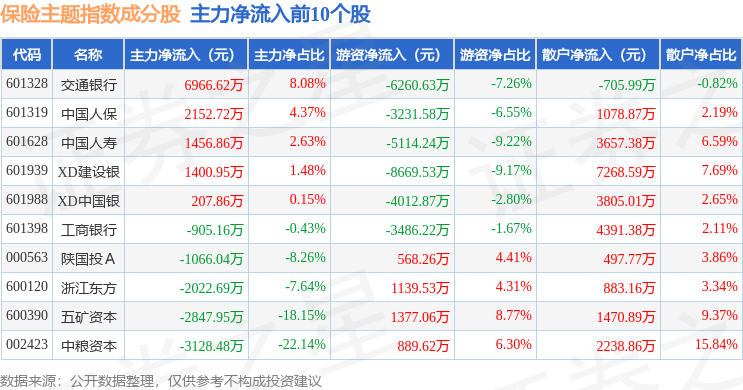 资金流向方面,保险主题(399809)指数成份股当日主力资金净流出合计12.14亿元,游资资金净流入合计2.5亿元,散户资金净流入合计9.64亿元。成份股资金流向详情见下表: