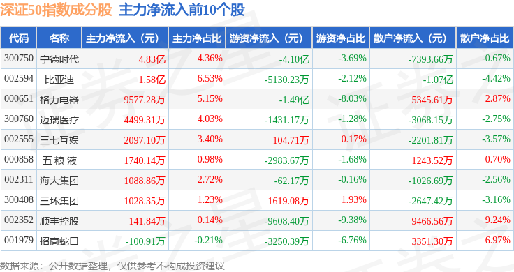 资金流向方面,深证50(399850)指数成份股当日主力资金净流出合计130.14亿元,游资资金净流入合计52.76亿元,散户资金净流入合计77.39亿元。成份股资金流向详情见下表: