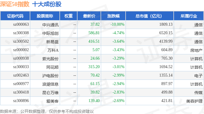 证券之星消息,12月11日,深证50(399850)指数报收于9090.78点,跌1.57%,成交1447.37亿元,换手率1.42%。当日该指数成份股中,上涨的有6家,宁德时代以1.73%的涨幅领涨,下跌的有43家,中兴通讯以10.0%的跌幅领跌。
