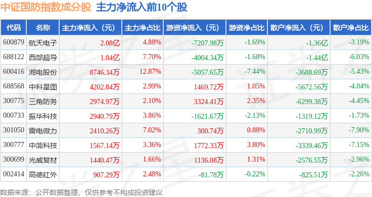 资金流向方面,中证国防(399973)指数成份股当日主力资金净流出合计11.07亿元,游资资金净流入合计1.24亿元,散户资金净流入合计9.83亿元。成份股资金流向详情见下表: