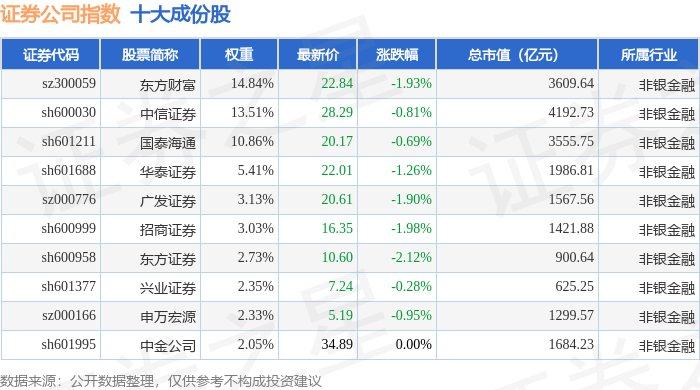 证券之星消息,12月11日,证券公司(399975)指数报收于837.7点,跌1.26%,成交250.16亿元,换手率0.82%。当日该指数成份股中,上涨的有1家,中信建投以0.99%的涨幅领涨,下跌的有45家,国盛证券以3.2%的跌幅领跌。