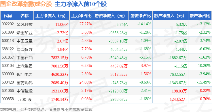 资金流向方面,国企改革(399974)指数成份股当日主力资金净流出合计69.22亿元,游资资金净流入合计18.51亿元,散户资金净流入合计50.71亿元。成份股资金流向详情见下表: