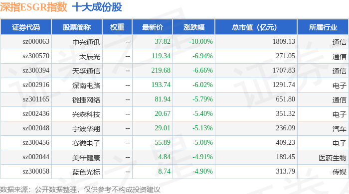 证券之星消息,12月11日,深指ESGR(470026)指数报收于18824.6点,跌1.3%,成交4088.8亿元,换手率1.45%。当日该指数成份股中,上涨的有57家,迈为股份以12.82%的涨幅领涨,下跌的有341家,中兴通讯以10.0%的跌幅领跌。