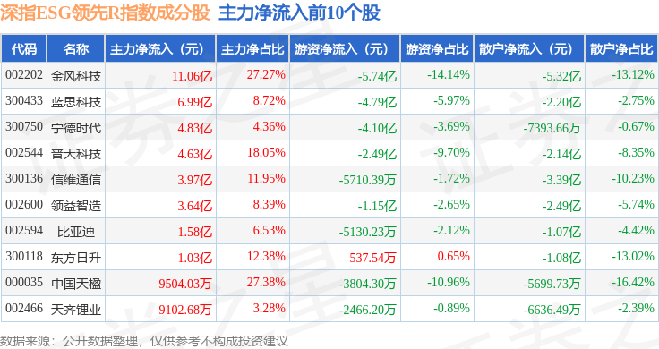 资金流向方面,深指ESG领先R(470029)指数成份股当日主力资金净流出合计153.55亿元,游资资金净流入合计54.25亿元,散户资金净流入合计99.3亿元。成份股资金流向详情见下表: