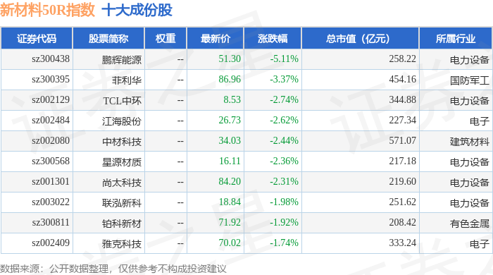 证券之星消息,12月11日,新材料50R(470042)指数报收于4075.86点,跌0.09%,成交724.21亿元,换手率2.64%。当日该指数成份股中,上涨的有14家,珂玛科技以10.44%的涨幅领涨,下跌的有35家,鹏辉能源以5.11%的跌幅领跌。