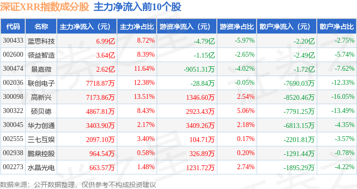 资金流向方面,深证XRR(470046)指数成份股当日主力资金净流出合计27.68亿元,游资资金净流入合计3.41亿元,散户资金净流入合计24.27亿元。成份股资金流向详情见下表: