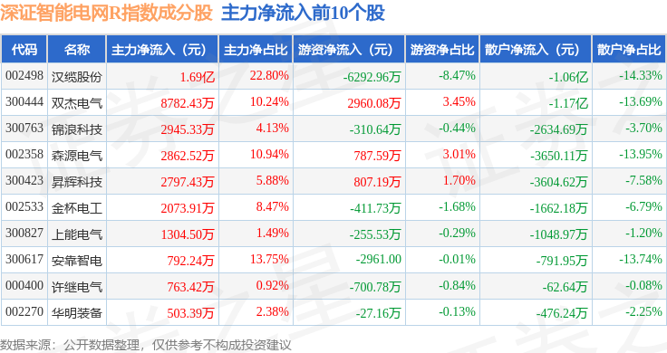 资金流向方面,深证智能电网R(470054)指数成份股当日主力资金净流出合计13.34亿元,游资资金净流入合计4.87亿元,散户资金净流入合计8.47亿元。成份股资金流向详情见下表: