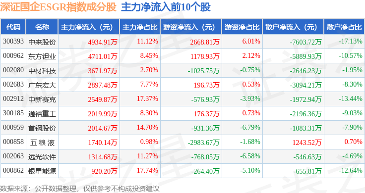 资金流向方面,深证国企ESGR(470055)指数成份股当日主力资金净流出合计18.64亿元,游资资金净流入合计4.04亿元,散户资金净流入合计14.61亿元。成份股资金流向详情见下表: