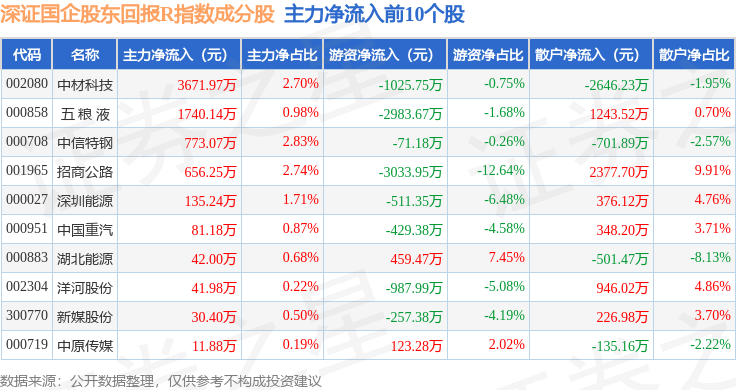 资金流向方面,深证国企股东回报R(470064)指数成份股当日主力资金净流出合计19.26亿元,游资资金净流入合计4.25亿元,散户资金净流入合计15.01亿元。成份股资金流向详情见下表: