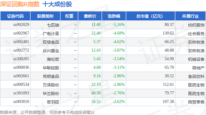 证券之星消息,12月11日,深证回购R(470063)指数报收于3169.69点,跌1.26%,成交171.64亿元,换手率1.46%。当日该指数成份股中,上涨的有10家,京新药业以3.63%的涨幅领涨,下跌的有39家,七匹狼以5.16%的跌幅领跌。