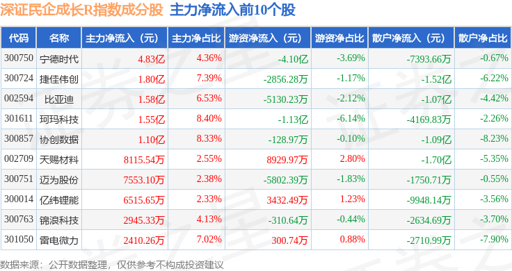 资金流向方面,深证民企成长R(470071)指数成份股当日主力资金净流出合计71.68亿元,游资资金净流入合计39.9亿元,散户资金净流入合计31.78亿元。成份股资金流向详情见下表: