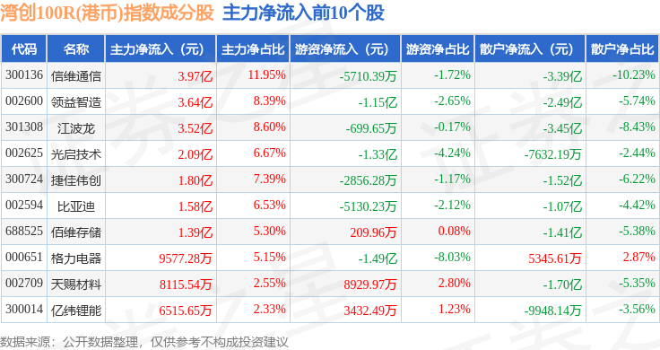 资金流向方面,湾创100R(港币)(480002)指数成份股当日主力资金净流出合计112.06亿元,游资资金净流入合计27.62亿元,散户资金净流入合计84.44亿元。成份股资金流向详情见下表: