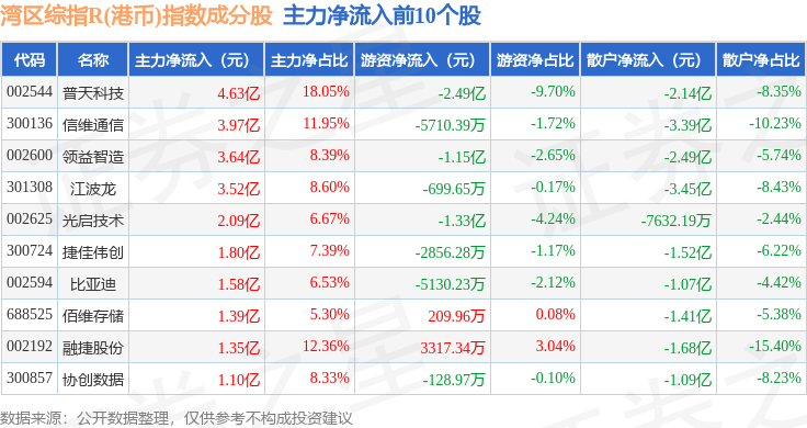 资金流向方面,湾区综指R(港币)(480004)指数成份股当日主力资金净流出合计143.72亿元,游资资金净流入合计30.56亿元,散户资金净流入合计113.7亿元。成份股资金流向详情见下表: