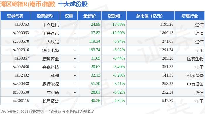湾区综指R(港币)(480004)指数十大成份股详情如下: