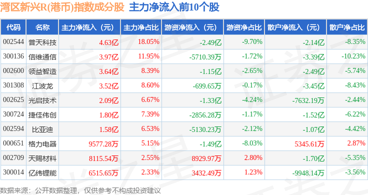 资金流向方面,湾区新兴R(港币)(480008)指数成份股当日主力资金净流出合计78.95亿元,游资资金净流入合计15.37亿元,散户资金净流入合计63.59亿元。成份股资金流向详情见下表: