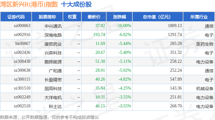 湾区新兴R(港币)(480008)指数十大成份股详情如下: