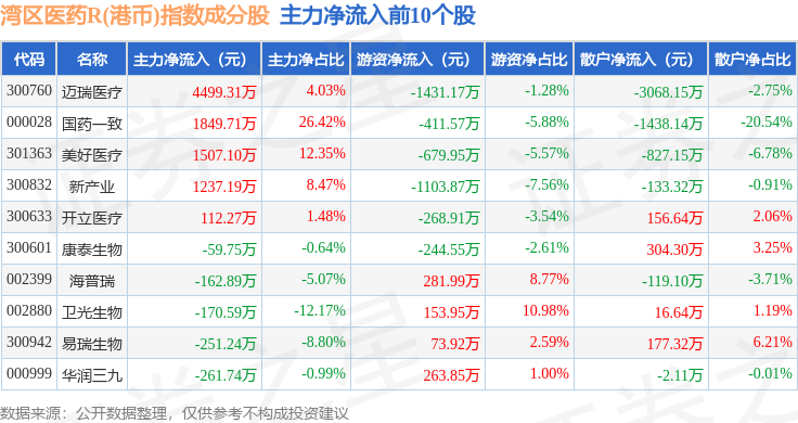 资金流向方面,湾区医药R(港币)(480014)指数成份股当日主力资金净流出合计1.13亿元,游资资金净流出合计847.89万元,散户资金净流入合计1.21亿元。成份股资金流向详情见下表: