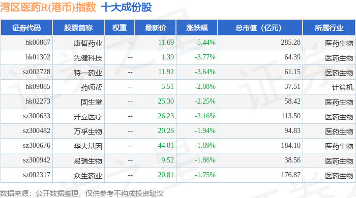 湾区医药R(港币)(480014)指数十大成份股详情如下: