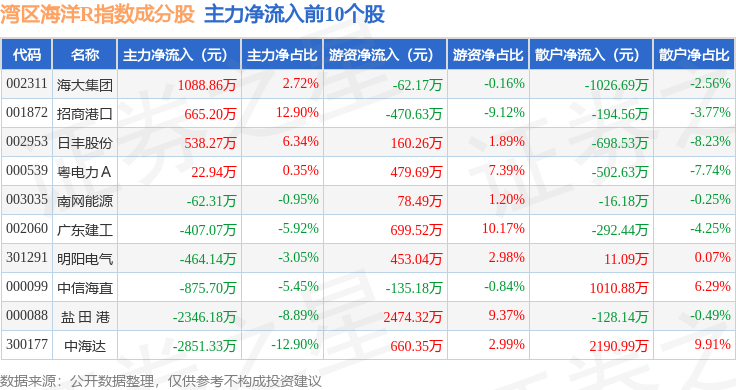 资金流向方面,湾区海洋R(480019)指数成份股当日主力资金净流出合计3.12亿元,游资资金净流入合计6767.75万元,散户资金净流入合计2.44亿元。成份股资金流向详情见下表:
