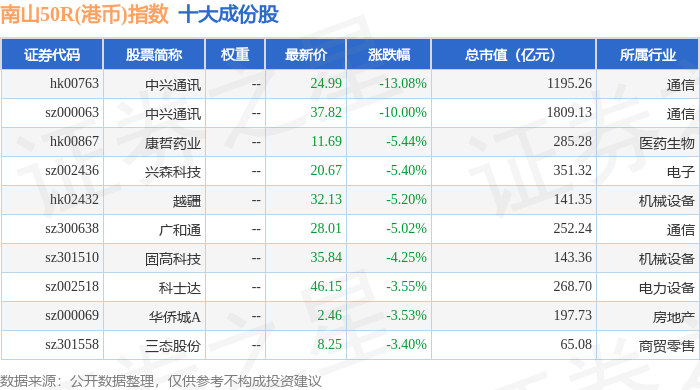 南山50R(港币)(480024)指数十大成份股详情如下: