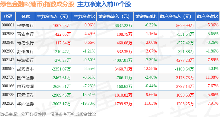 资金流向方面,绿色金融R(港币)(480053)指数成份股当日主力资金净流出合计22.31亿元,游资资金净流入合计4.94亿元,散户资金净流入合计17.37亿元。成份股资金流向详情见下表:
