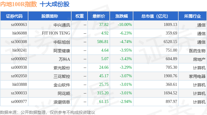 内地100R(483001)指数十大成份股详情如下: