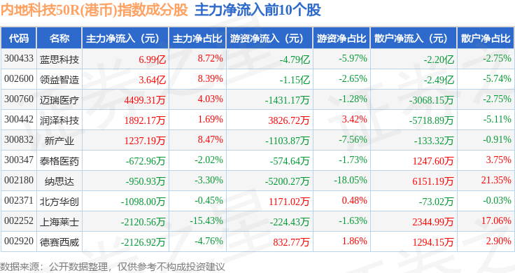 资金流向方面,内地科技50R(港币)(483004)指数成份股当日主力资金净流出合计73.97亿元,游资资金净流入合计17.68亿元,散户资金净流入合计56.29亿元。成份股资金流向详情见下表: