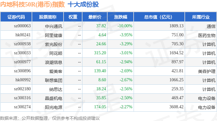 内地科技50R(港币)(483004)指数十大成份股详情如下: