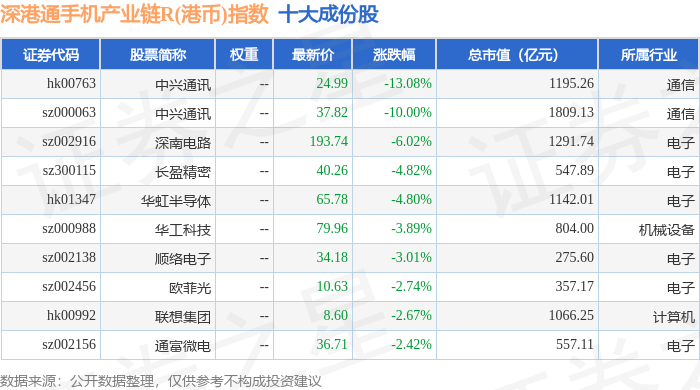 深港通手机产业链R(港币)(483010)指数十大成份股详情如下: