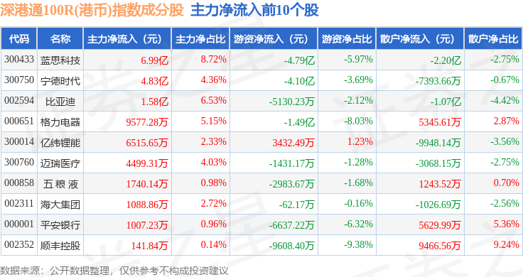 资金流向方面,深港通100R(港币)(483008)指数成份股当日主力资金净流出合计118.25亿元,游资资金净流入合计43.34亿元,散户资金净流入合计74.92亿元。成份股资金流向详情见下表: