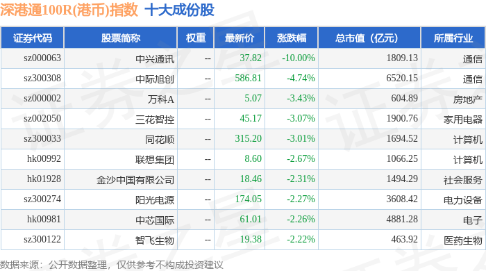 深港通100R(港币)(483008)指数十大成份股详情如下: