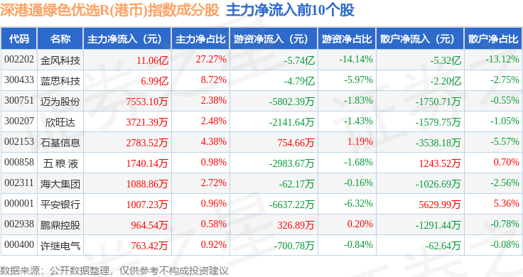 资金流向方面,深港通绿色优选R(港币)(483012)指数成份股当日主力资金净流出合计53.48亿元,游资资金净流入合计5.02亿元,散户资金净流入合计48.45亿元。成份股资金流向详情见下表: