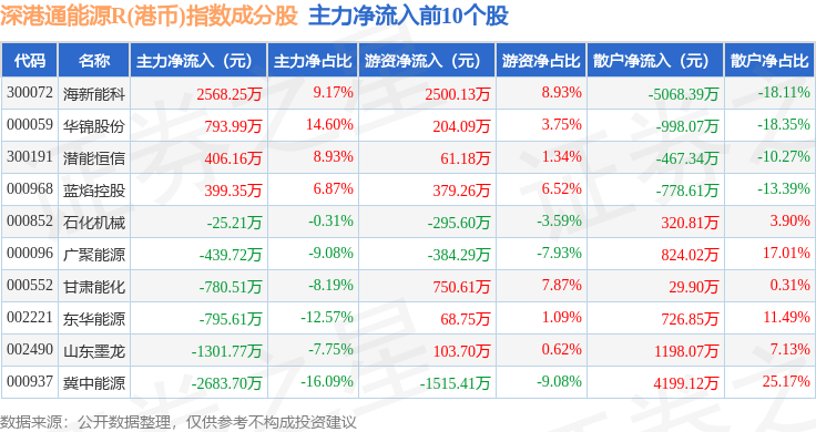 资金流向方面,深港通能源R(港币)(483014)指数成份股当日主力资金净流出合计1.76亿元,游资资金净流入合计9124.37万元,散户资金净流入合计8457.58万元。成份股资金流向详情见下表: