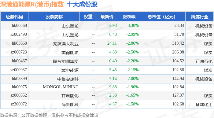深港通能源R(港币)(483014)指数十大成份股详情如下: