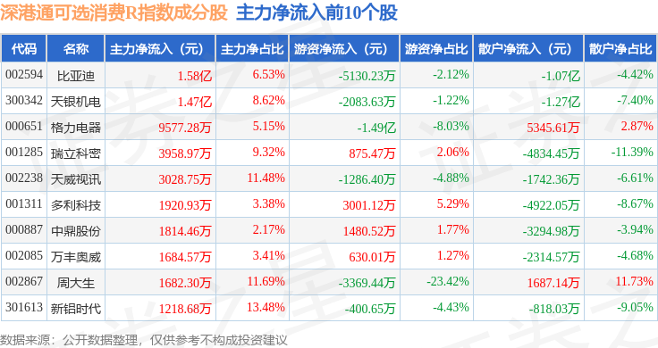 资金流向方面,深港通可选消费R(483019)指数成份股当日主力资金净流出合计77.86亿元,游资资金净流入合计2.67亿元,散户资金净流入合计75.2亿元。成份股资金流向详情见下表: