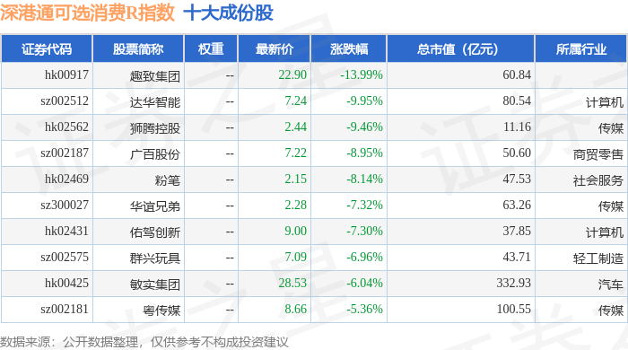 深港通可选消费R(483019)指数十大成份股详情如下: