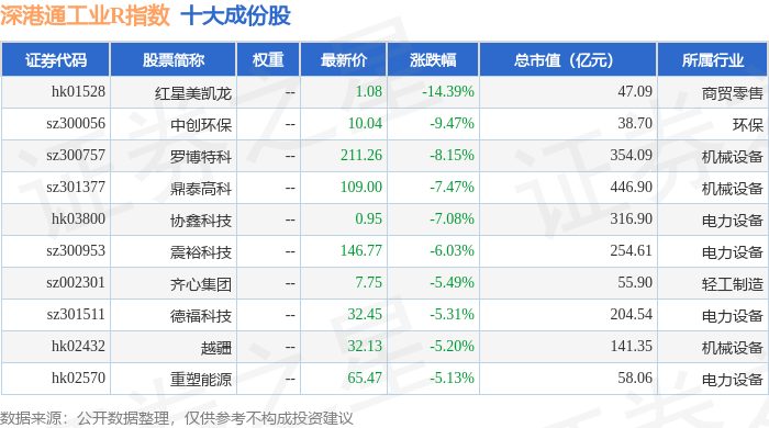 证券之星消息,12月11日,深港通工业R(483017)指数报收于6114.76点,跌0.49%,成交2056.98亿元,换手率2.15%。当日该指数成份股中,上涨的有106家,迈为股份以12.82%的涨幅领涨,下跌的有357家,红星美凯龙以14.39%的跌幅领跌。