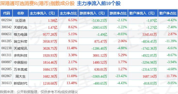 资金流向方面,深港通可选消费R(港币)(483020)指数成份股当日主力资金净流出合计77.86亿元,游资资金净流入合计2.67亿元,散户资金净流入合计75.2亿元。成份股资金流向详情见下表: