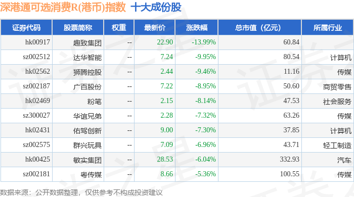 深港通可选消费R(港币)(483020)指数十大成份股详情如下: