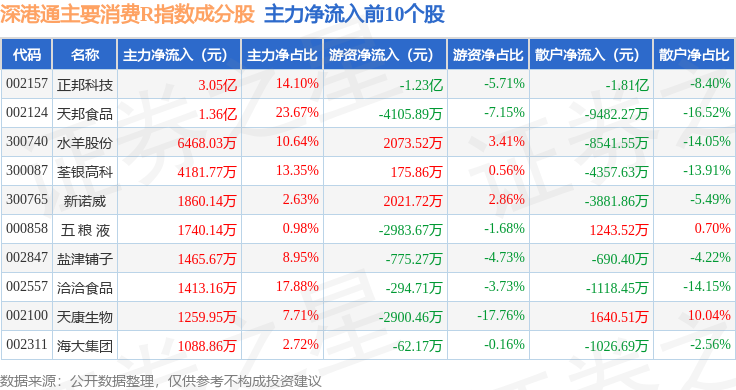 资金流向方面,深港通主要消费R(483021)指数成份股当日主力资金净流出合计11.25亿元,游资资金净流入合计1.41亿元,散户资金净流入合计9.83亿元。成份股资金流向详情见下表: